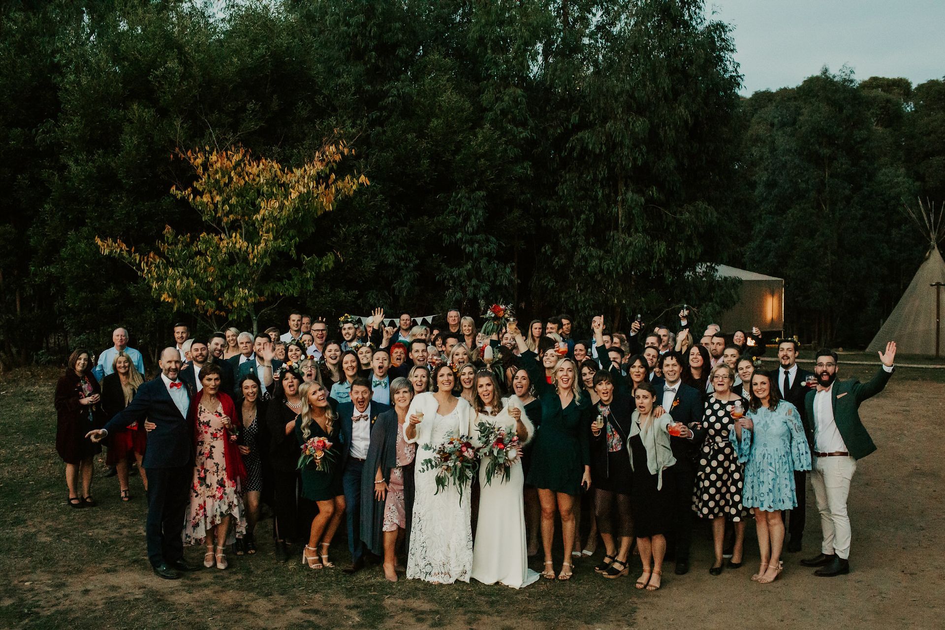 ‘The Hanger’ was an incredible space for our guests to enjoy ‘happy hour’ drinks and nibbles in the open air while we frolicked through the beautiful forest for our photos. The reception hall was perfect for our guests to indulge in pizza from the food truck out the front, chill by the fire on the balcony or head inside to grab a drink at the bar and hit the D-floor. Spending the night glamping on site and waking up to all our smiling friends and family who had slept the night was the icing on the (wedding) cake.